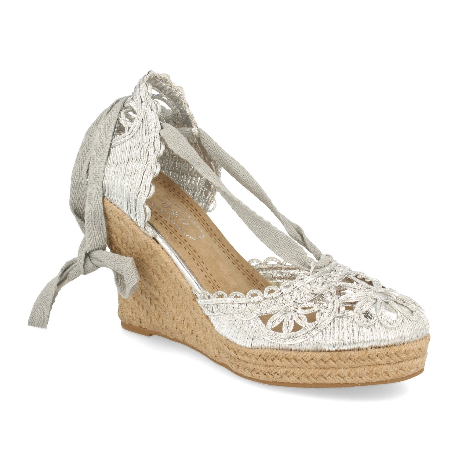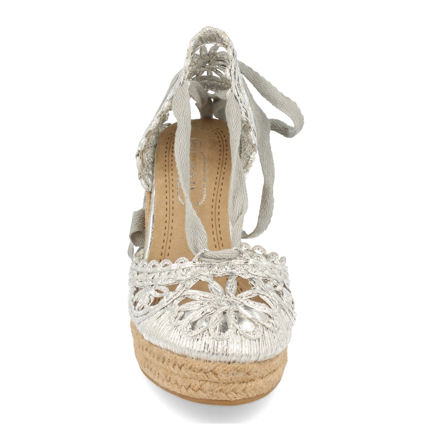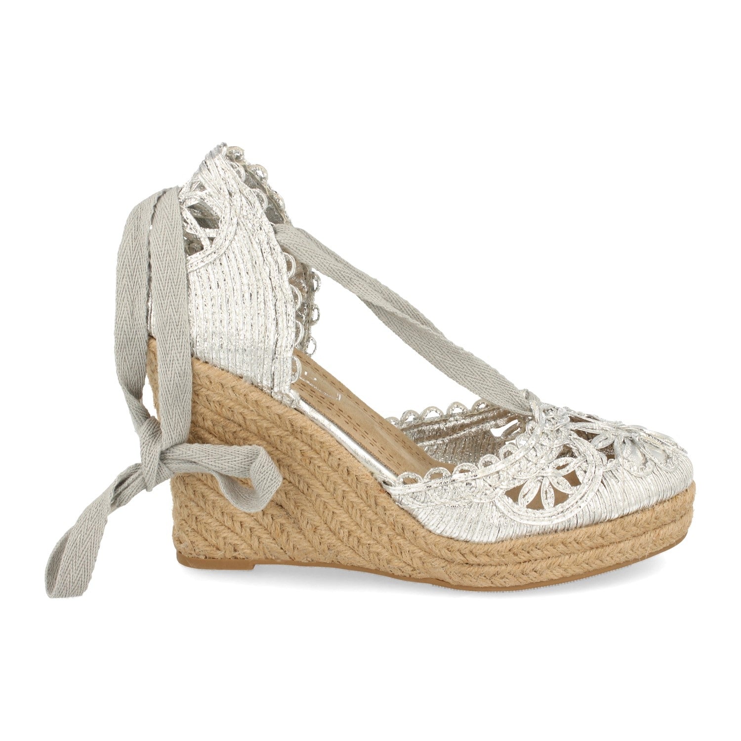 Sandalia de Cuña con Yute Estilo Valenciana Pala con Tiras Cosidas en Forma de Petalos de Flor y Cierre de Cordones en el Tobillo Primavera Verano 2020